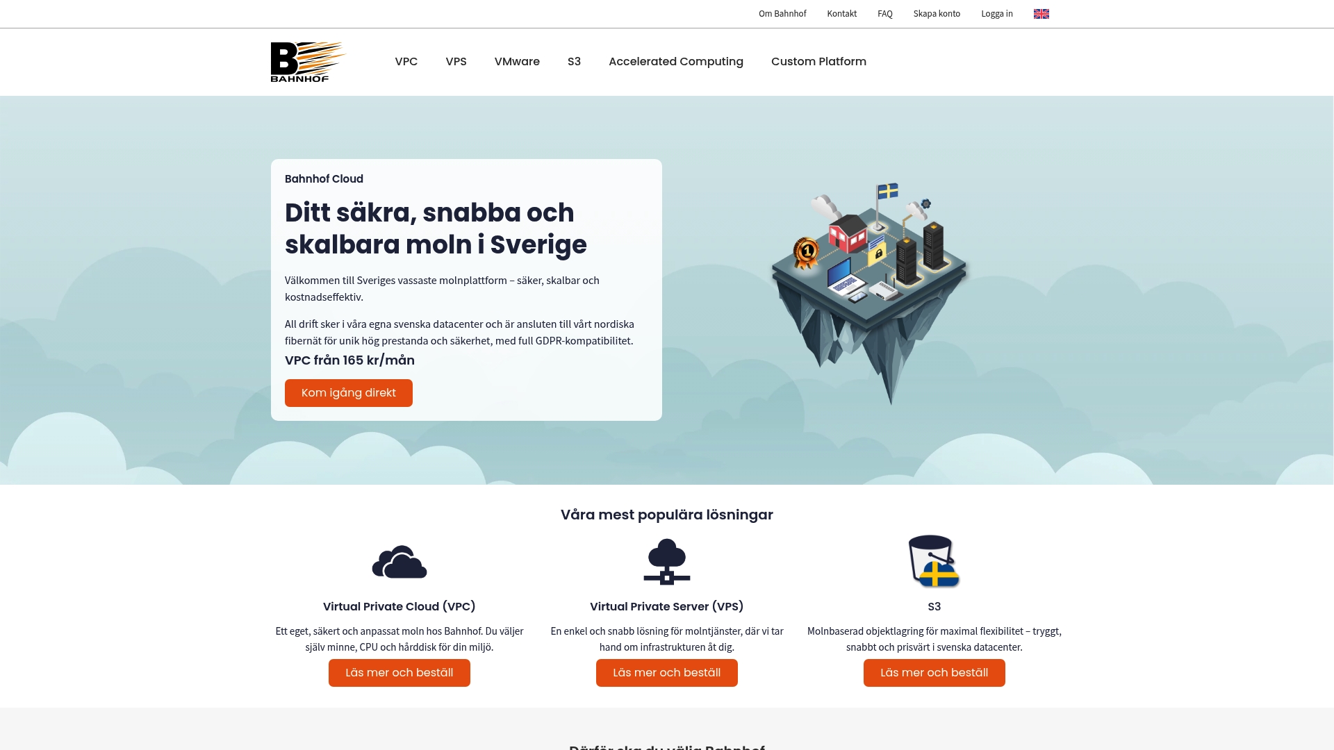 Bahnhof Cloud runs all services from Swedish data centers connected by a Nordic fiber network and offers Virtual Private Cloud VPC, Virtual Private Server VPS, and S3 object storage. The provider highlights redundant 24/7 monitoring, private infrastructure control, and environmentally friendly power plus heat recycling.