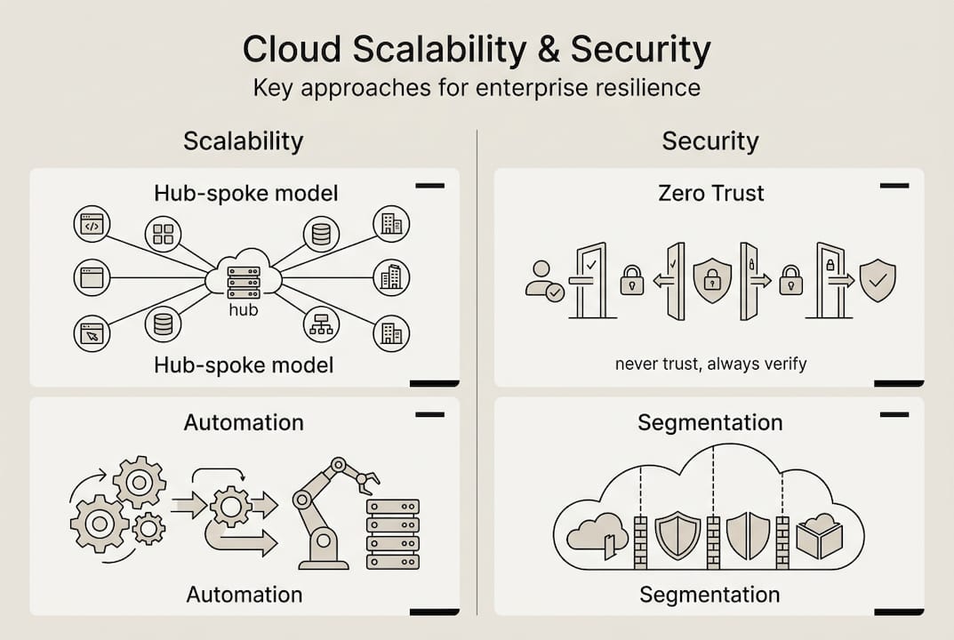 | Security | Cloud provider defaults plus basic hardening | Zero Trust, micro-segmentation, compliance frameworks |