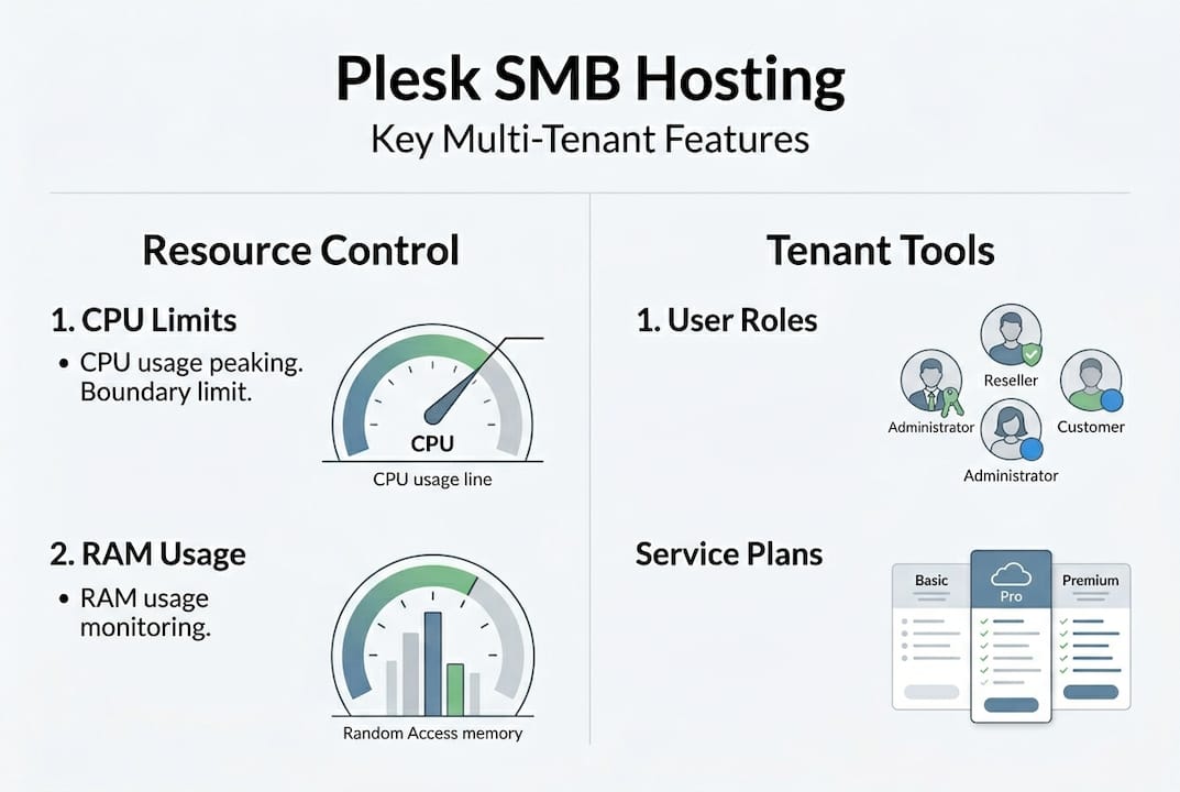 For reliable SMB hosting, prioritize Plesk Web Pro Edition with CloudLinux for resource isolation and efficiency. The combination gives you tenant-level protection without sacrificing performance.