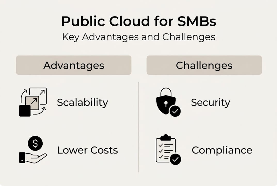But the risks are equally real. Public cloud is ideal for SMBs needing scalability without CapEx, but you must actively manage security configuration, compliance, and costs.