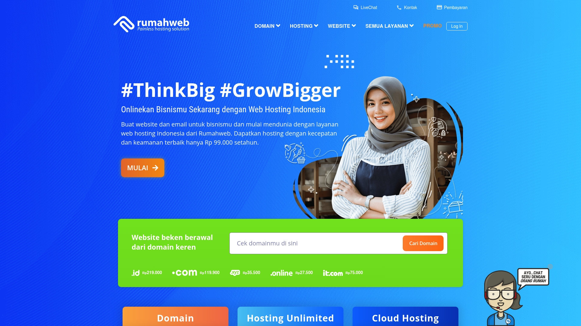 Rumahweb combines affordable domain options with cloud computing based web hosting, KVM and Alibaba Cloud VPS, an AI Website Builder, and business grade email including Google Workspace and OX Mail. These capabilities support everything from simple sites to high traffic portals.