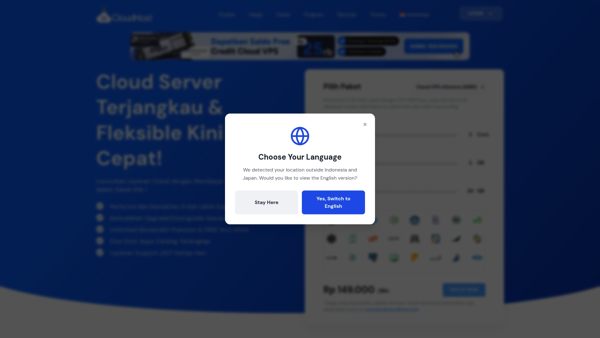 Pricing starts at Rp 25.000 per month for web hosting. Cloud hosting begins at Rp 90.000 per month. VPS plans start from Rp 100.000 per month.