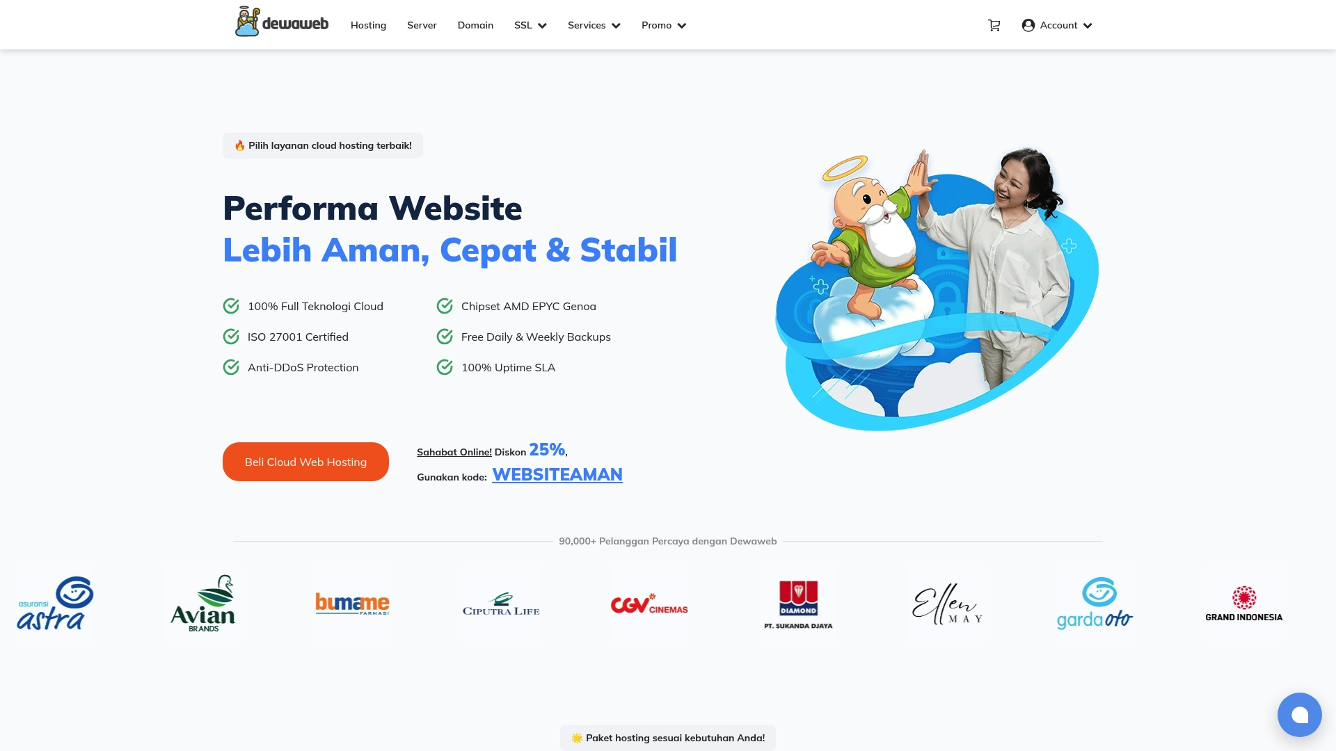 | Dewaweb | Cloud Hosting, Free SSL, Anti-DDoS Protection | ISO 27001 certification, automated backups, multiple data center choices | Businesses needing reliable, compliant cloud services | Starting from Rp 35.000/month |